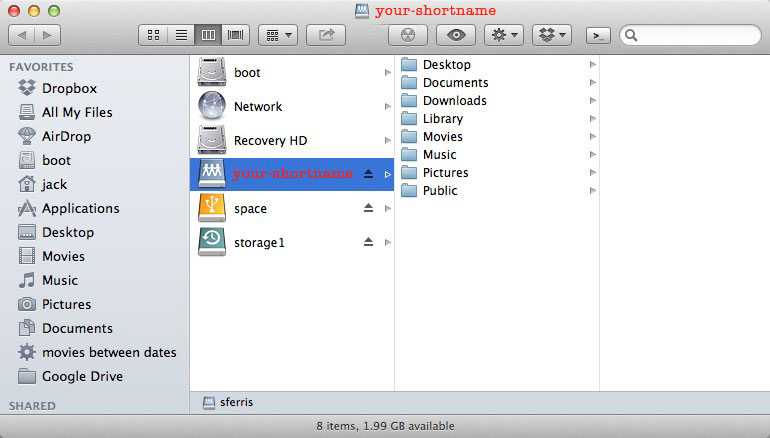 In order to get started, you need to set the password on your account. A temporary one has been set for you with a home directory size limit of 2 GB. You will be told the temporary password at the beginning of your tenure with the program, and will immediately reset it to something you prefer. Because of various limitations placed on home versions of the Microsoft platform, as well as security issues involving Windows, everything below applies to Apple hardware, only (sorry).