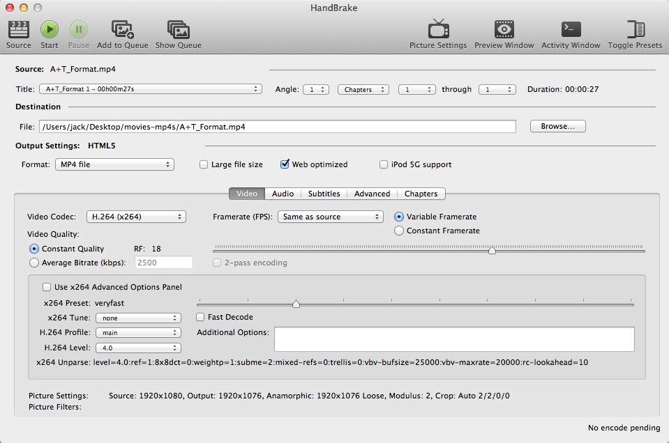 This will produce an archival version of your movie. NOTE: this will NOT produce the file you'll upload anywhere! It is waaay too big. The ProRes file is a lossless compressed working version of your file which you will subsequently use to created web-streamable (and other) versions of your movie. Think of this like a .tif or .psd version of your file as opposed to a .jpg version. You may want to burn this file to a data DVD or save it to a disc as an archive. Next, we'll open Handbrake (free and installed on the lab computers) and use it to produce a much smaller (compressed) and streaming-capable mp4 video file.