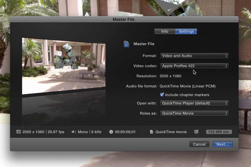 In the Share dialog set the codec to ProRes 422. Others, like ProRes 444 and HQ are available, but for our purposes, regular ProRes is fine. If your movie has no audio, select Video Only.