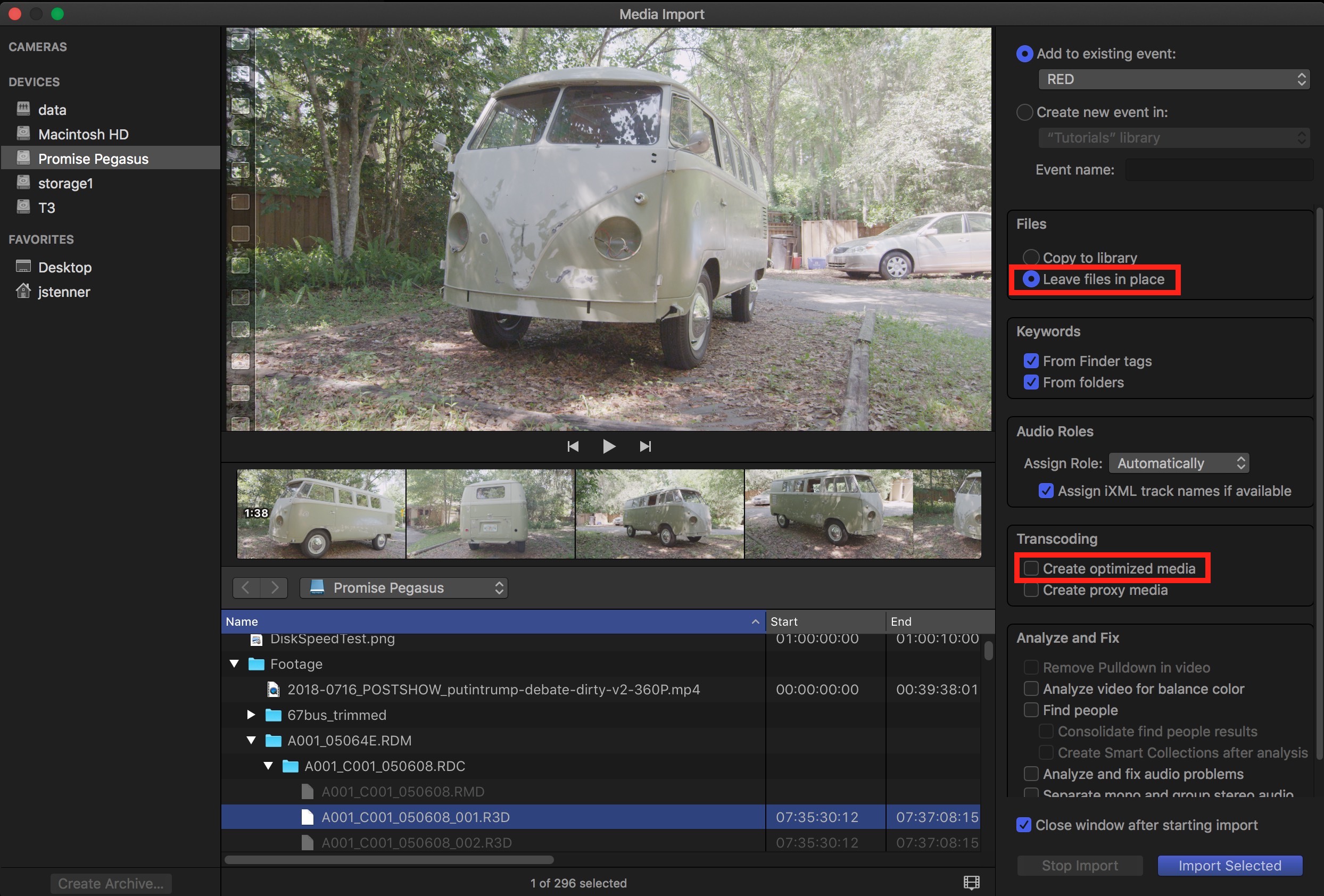 Copy your shot(s) from your Red Mag and place them in your working directory on Titaniumz-share (our SAN/RAID). Using FCPX (v.10.4.5 as of Spring 2019) import your footage choosing to "Leave files in place" and work directly with the RED RAW files (uncheck "Create optimized media").