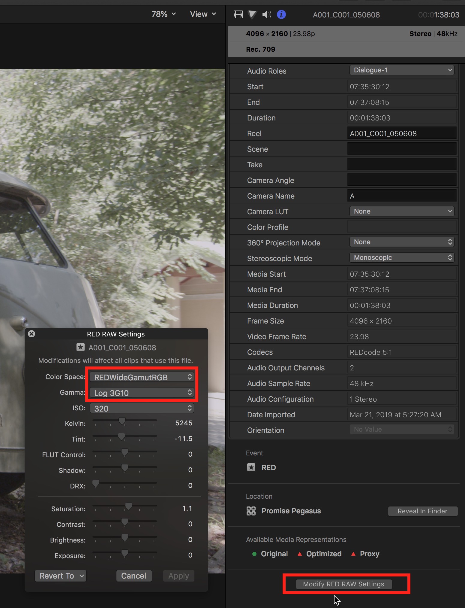 For each clip, set your Color Space to REDWideGamutRGB and Gamma Space to Log3G10. This returns the footage to its RAW, full spectrum state.