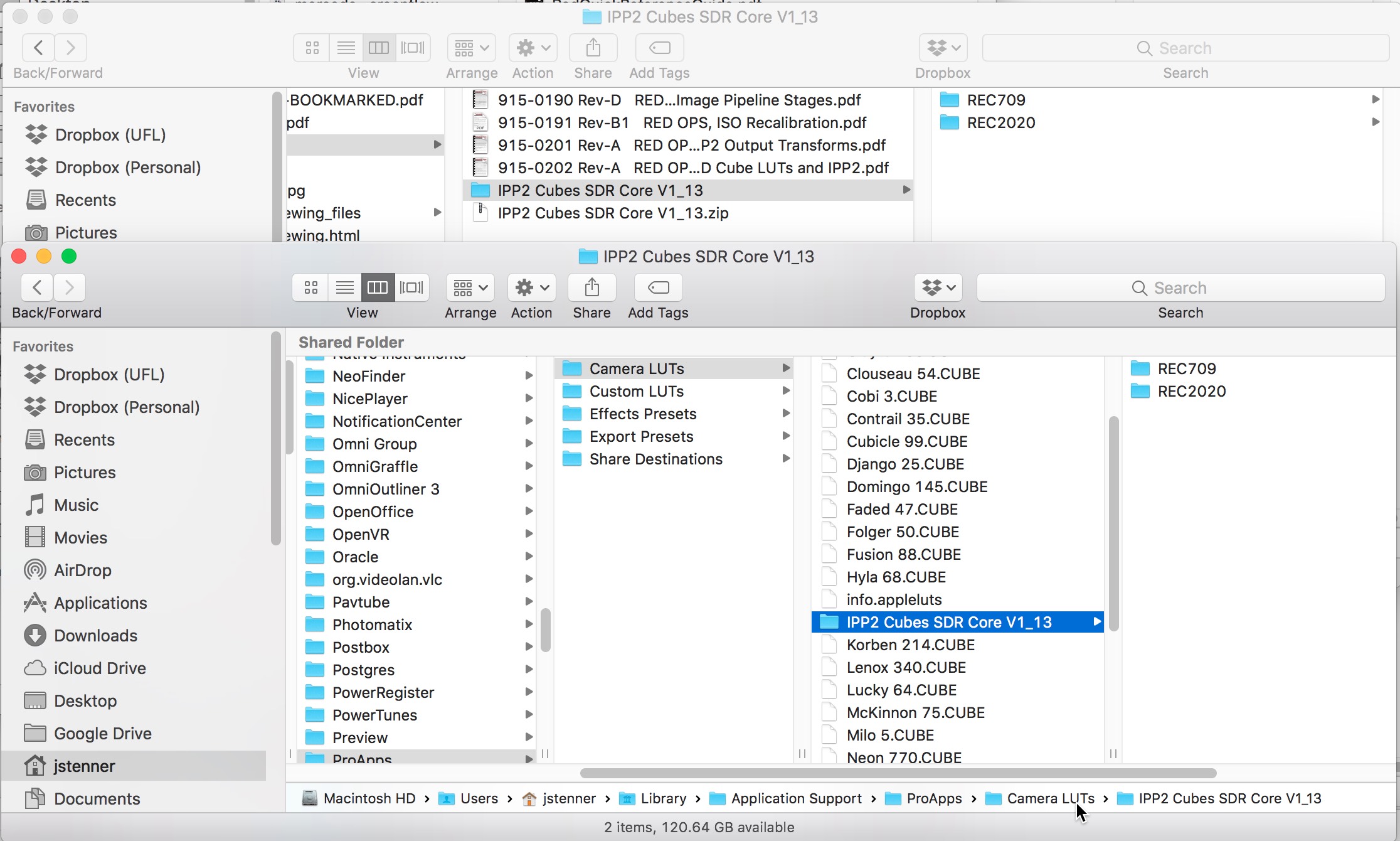 Next, we need to map our full spectrum RAW video to one of the Rec709 color spaces (unless we're working in Rec2020 - not likely in Spring 2020). These "output transforms" are provided by RED. Since they aren't installed by default in your FAC302 Mac Pro home area, you'll need to install them yourself. Here's how: navigate to the Titaniumz-share/RED/ directory and prepare to copy the entire IPP2 Cubes SDR Core V1_13 folder to the appropriate directory in your local account. You can find this directory via the Settings pane in FCPX: