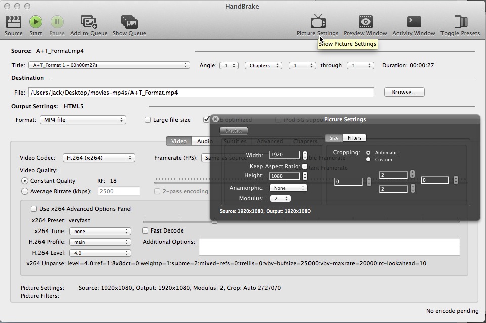 This will produce an archival version of your movie. NOTE: this will NOT produce the file you'll upload anywhere! It is waaay too big. The ProRes file is a lossless compressed working version of your file which you will subsequently use to created web-streamable (and other) versions of your movie. Think of this like a .tif or .psd version of your file as opposed to a .jpg version. You may want to burn this file to a data DVD or save it to a disc as an archive. Next, we'll open Handbrake (free and installed on the lab computers) and use it to produce a much smaller (compressed) and streaming-capable mp4 video file.