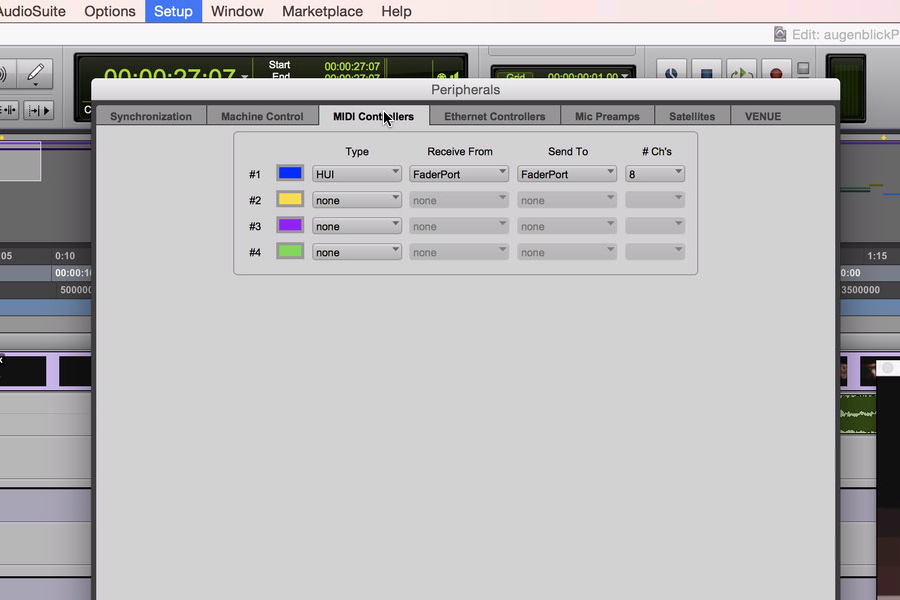 Setup->Peripherals (note Fader Port Config!):