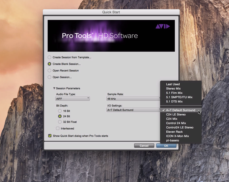 When you launch Pro Tools it will present a dialog, asking how you want to proceed. Every Pro Tools project is considered a "session." If you're starting from scratch, you'll want to select "Create Blank Session." The key thing here is to select the I/O Setting template (I/O = input/output) that we have configured for you in the I/O Settings dropdown in the following dialog: